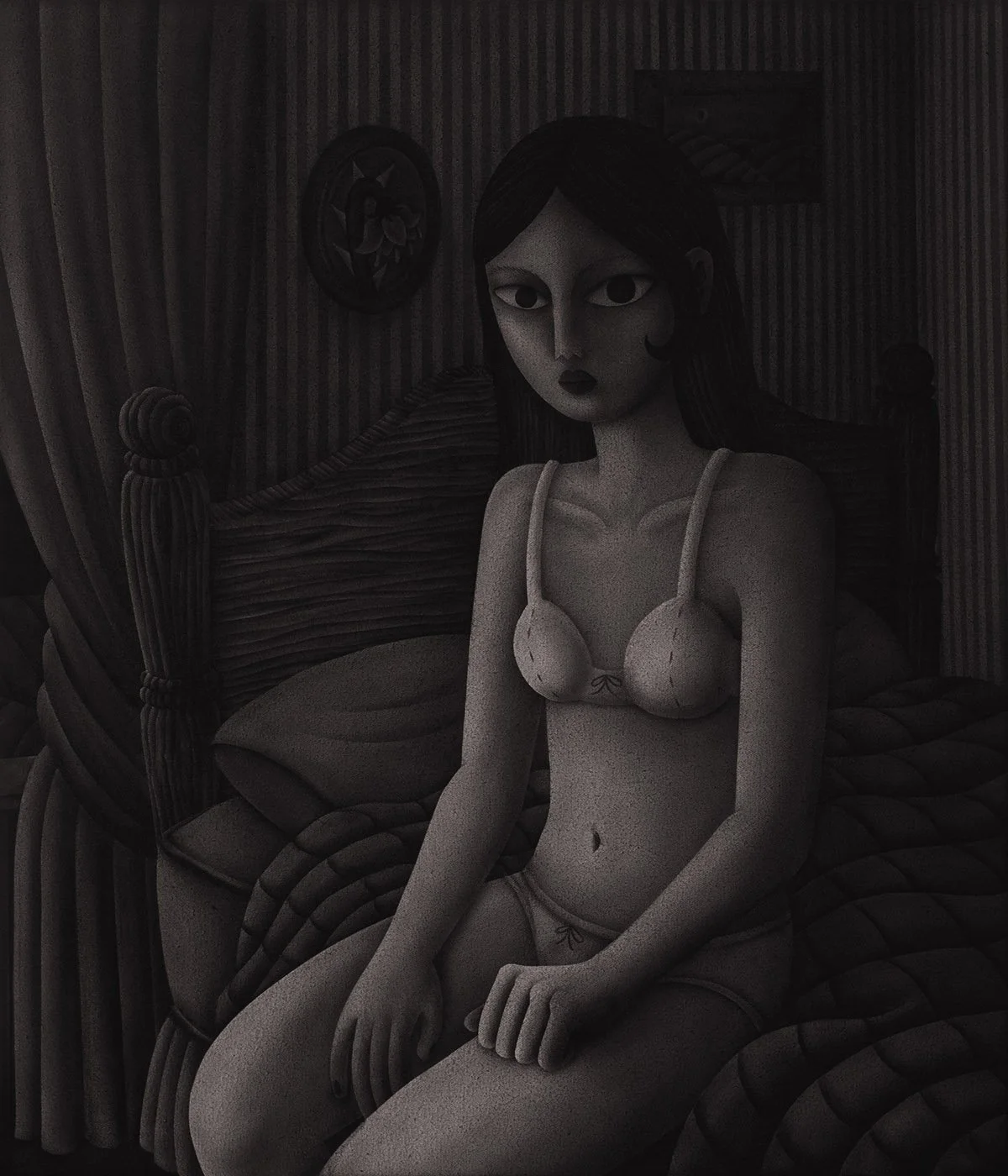 Sitting on Bed, 30" x 24", acrylic on canvas, 2024. Shown with Art For Change in benefit of When We All Vote in August 2024.