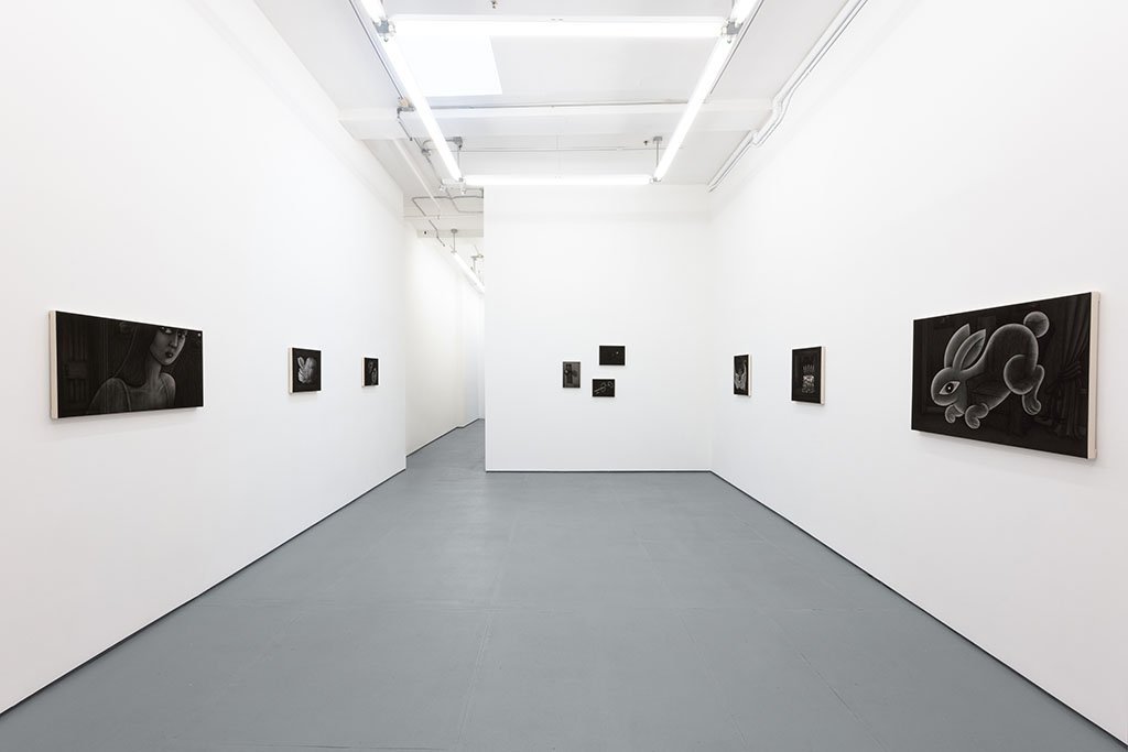 Set within the backdrop of an old rural house, ghosts and their haunted objects appear within carefully decorated striped and wood paneled interiors. Executed in a monochromatic palette, the paintings are reminiscent of an old aging photograph, like calling upon a long forgotten memory.